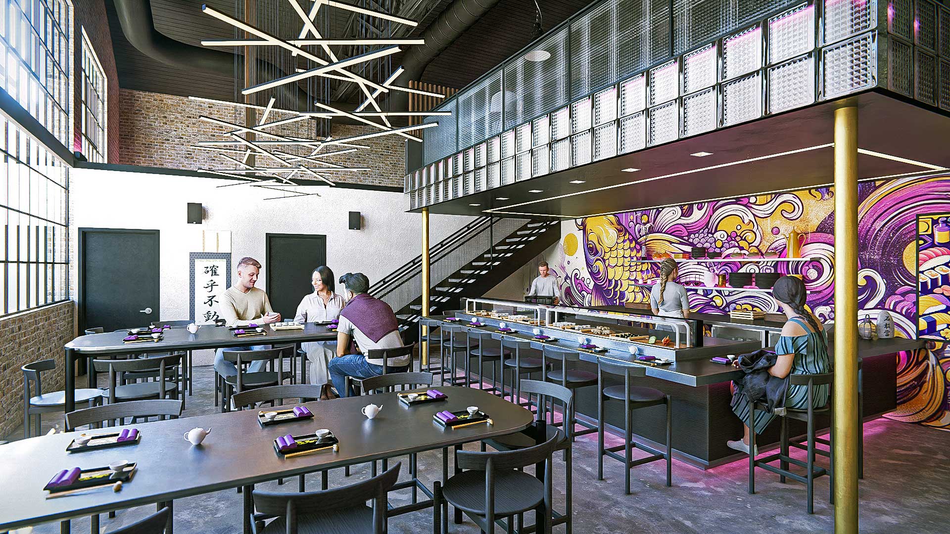 The space features distinctive amenities including a revolutionary self-pour wall offering craft beverages through state-of-the-art dispensing technology, and an exclusive 1,500 square foot mezzanine level perfect for private events with commanding views of the main hall below. The building’s former garage has been transformed into an atmospheric sushi concept, where dramatic lighting and contemporary design pay homage to the space.