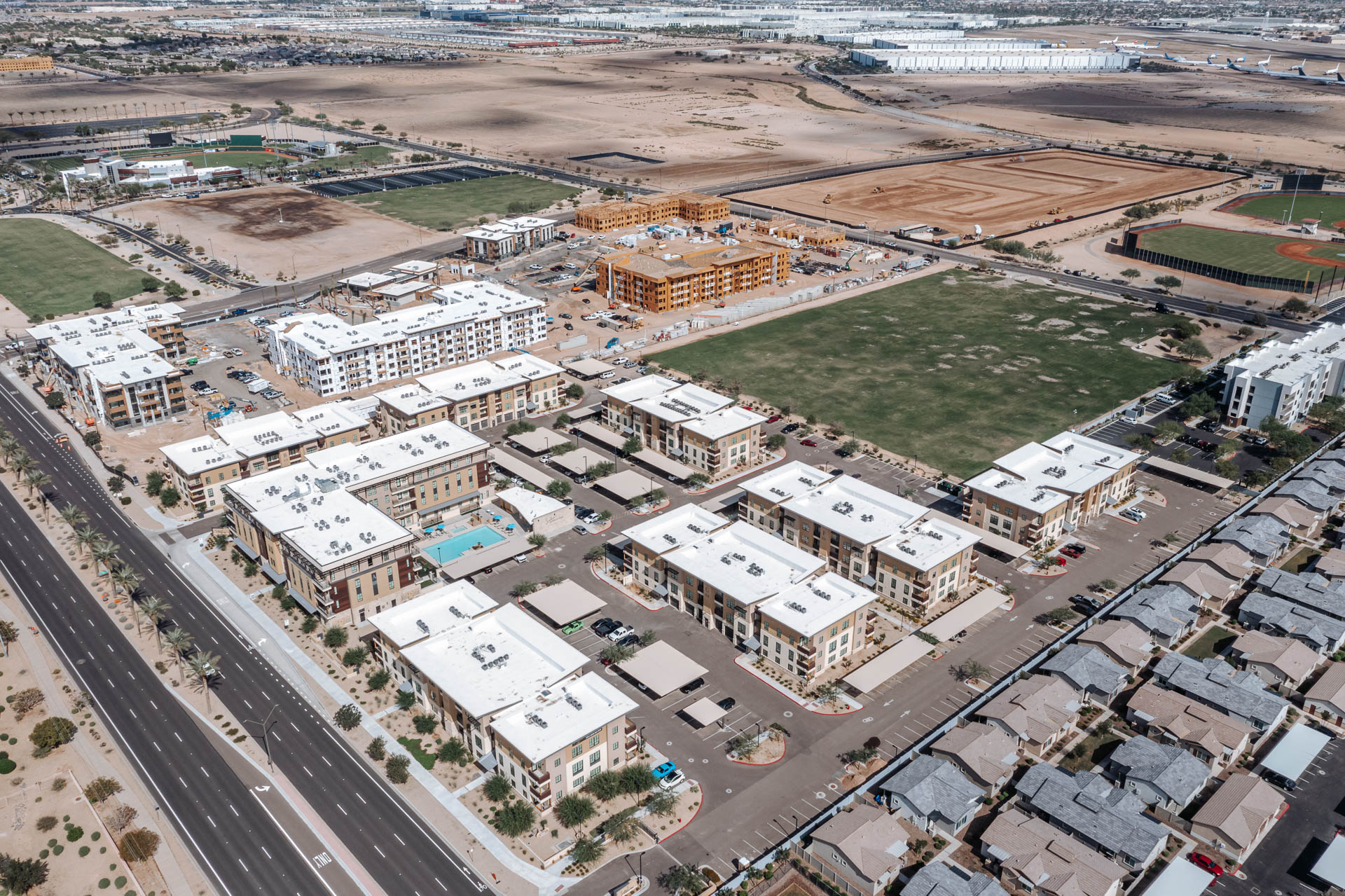 Revolve at Ballpark Village multifamily development sits next to Goodyear Ballpark and consists of various elements. The master plan for the development incorporates two 3-story walk-up buildings, four 4-story elevator buildings, and a clubhouse. The development encompasses 355 apartments with one-, two-, and three-bedroom units, each featuring a private balcony. To cater to parking needs, we offer parking garages, shades, and surface parking. The building exteriors are adorned with stone, stucco, and wood finishes, reflecting the natural essence of the Sonoran Desert environment.